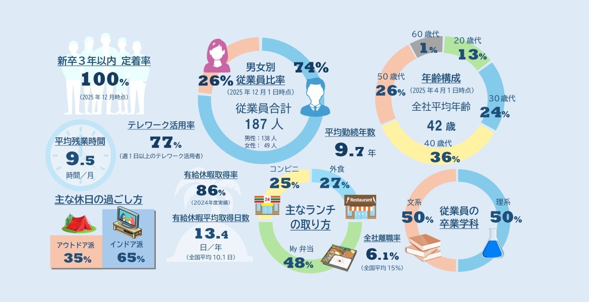 テクノツリーってどんな会社? 会社説明会や会社訪問だけでは、イメージしにくい部分もありますよね! そんな疑問に応えるため、当社での働き方や従業員情報を数字で紹介させていただきました。従業員数に占める女性の比率は、24%と低めですが、現在、積極的に採用を行っており女性比率が年々高まってきております。また、当社では仕事を個人の裁量に委ねていることが多いため、有給休暇が取りやすく、比較的残業も少ない環境です。そのため仕事をプライベートの両立もしっかりとできるため、離職率の低減、定着率の向上に繋がっております。